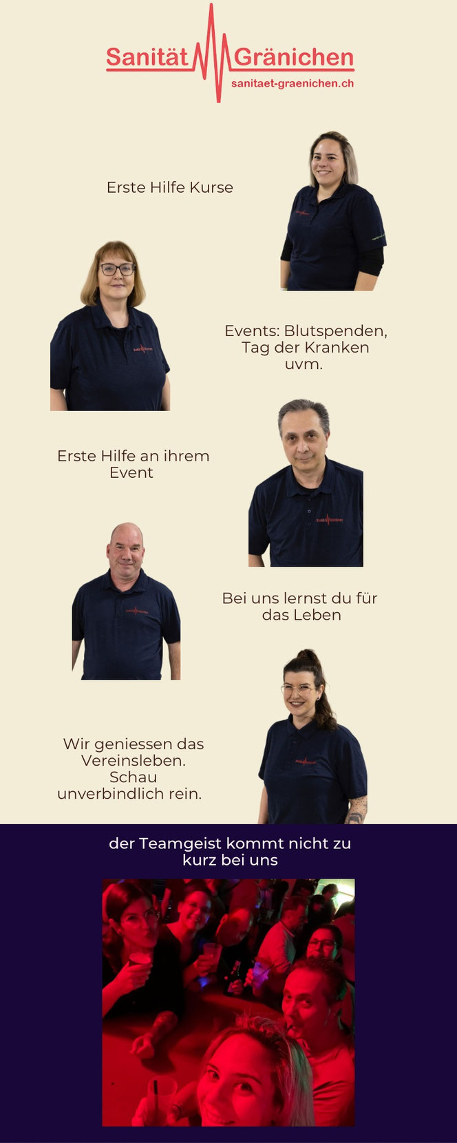 2020 wurde nach mehr als 90 Jahren aus dem Samariterverein Gränichen, der Sanitätsverein Gränichen. Uns begleitet Jahre lange Erfahrung, die wir mit Leidenschaft in den Verein und in den Sanitätsdienst einbringen.